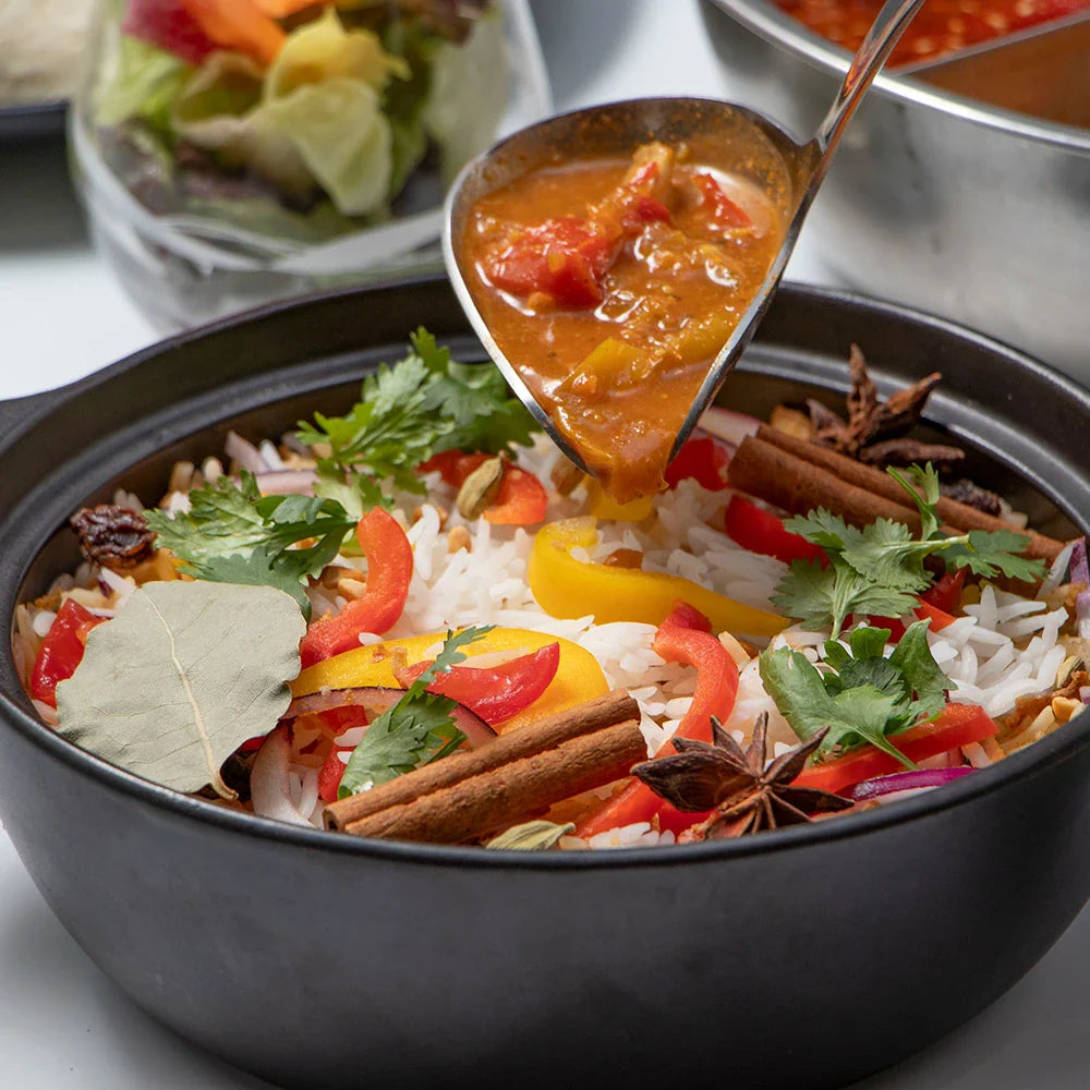 ブレンドしたスパイスが織りなす奥深い香りと、ふっくら炊き上げたバスマティライスの食感。ひと口ごとに広がる豊かな風味が食卓を彩ります。